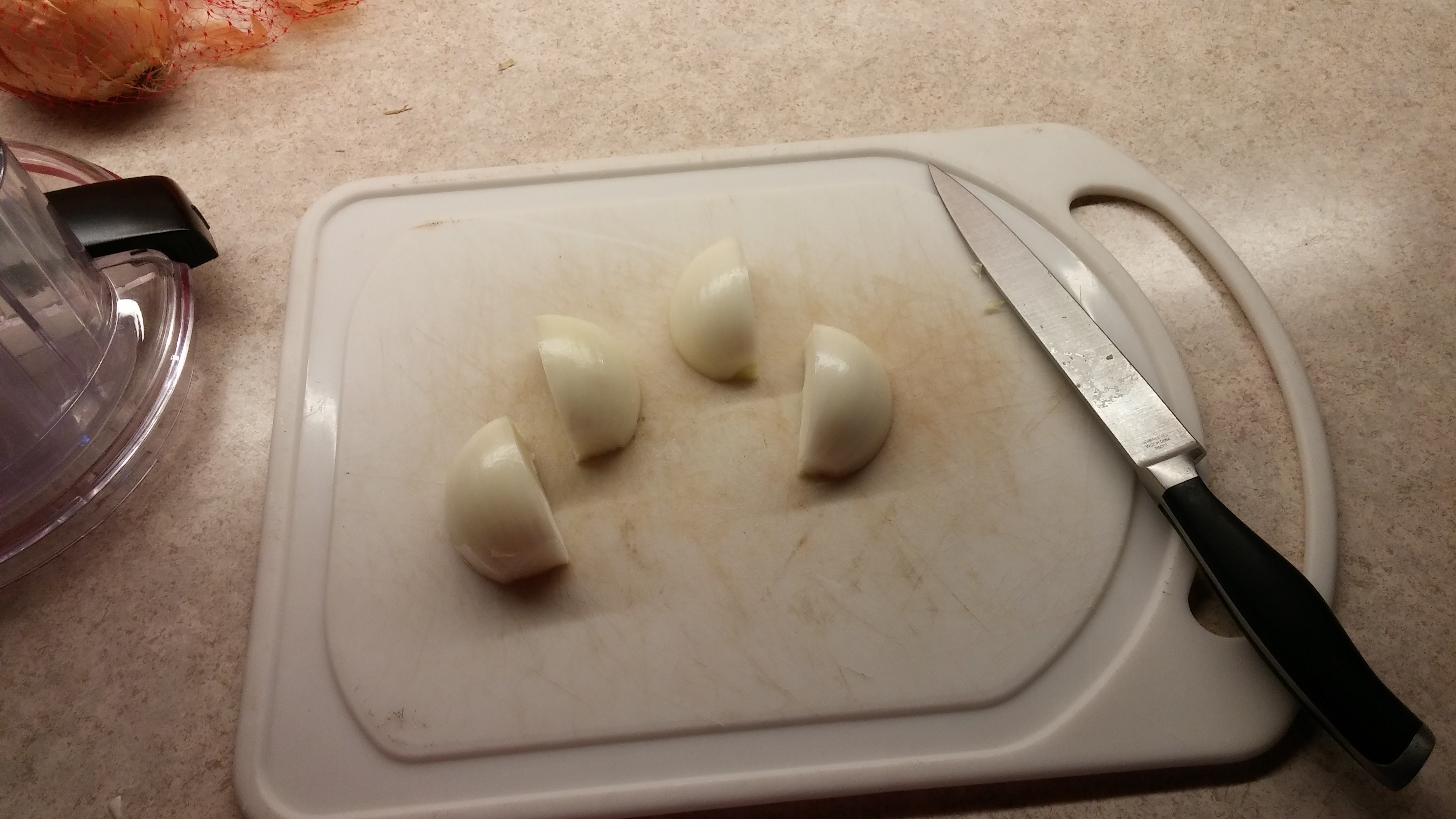 Chop the bottom and top of the onion off. Then chop into quarters and remove the outside skin. Place onions in food processor.